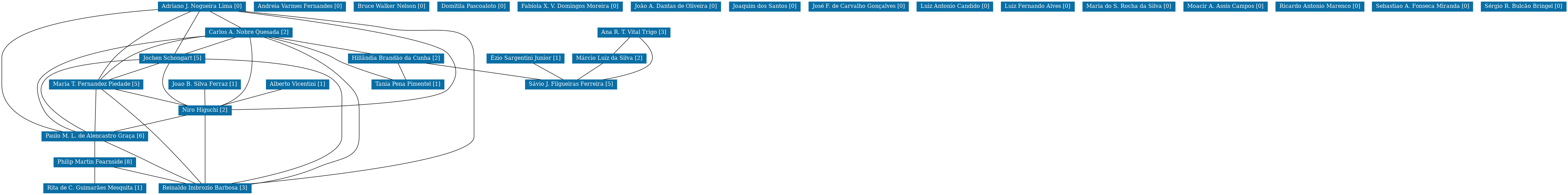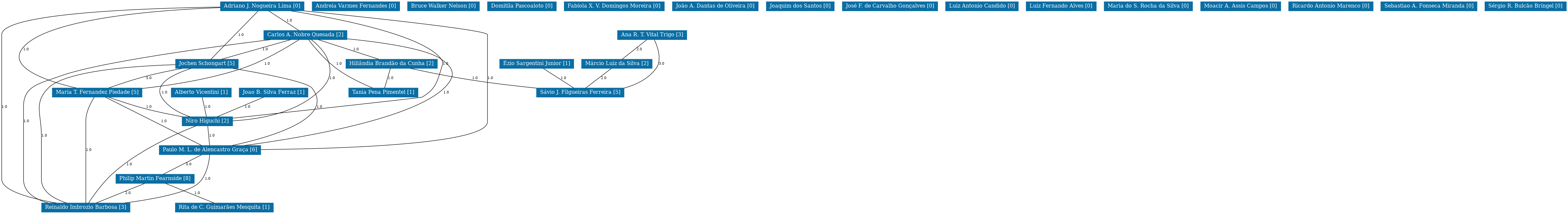 Clique no nome dentro do vértice para visualizar o currículo Lattes. Para cada nó: o valor entre colchetes indica o número de produções feitas em colaboração apenas com os outros membros do próprio grupo.
