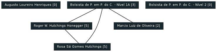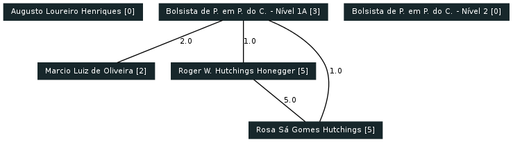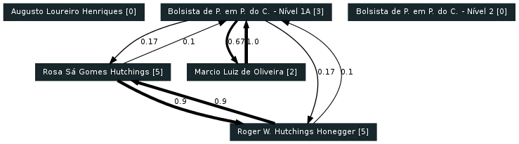 6 curriculos Lattes foram considerados, gerando os seguintes grafos de colaborações encontradas com base nas produções: Artigos completos publicados em periódicos, Livros publicados/organizados ou edições, Capítulos de livros publicados, Textos em jornais de notícias/revistas, Trabalhos completos publicados em anais de congressos, Resumos expandidos publicados em anais de congressos, Resumos publicados em anais de congressos, Artigos aceitos para publicação, Apresentações de trabalho, Demais tipos de produção bibliográfica.