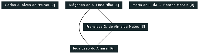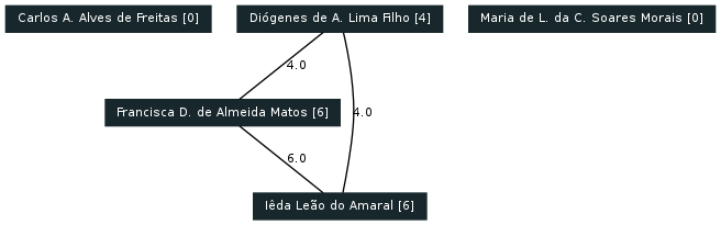 5 curriculos Lattes foram considerados, gerando os seguintes grafos de colaborações encontradas com base nas produções: Artigos completos publicados em periódicos, Livros publicados/organizados ou edições, Capítulos de livros publicados, Textos em jornais de notícias/revistas, Trabalhos completos publicados em anais de congressos, Resumos expandidos publicados em anais de congressos, Resumos publicados em anais de congressos, Artigos aceitos para publicação, Apresentações de trabalho, Demais tipos de produção bibliográfica.