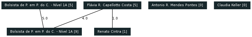 6 curriculos Lattes foram considerados, gerando os seguintes grafos de colaborações encontradas com base nas produções: Artigos completos publicados em periódicos, Livros publicados/organizados ou edições, Capítulos de livros publicados, Textos em jornais de notícias/revistas, Trabalhos completos publicados em anais de congressos, Resumos expandidos publicados em anais de congressos, Resumos publicados em anais de congressos, Artigos aceitos para publicação, Apresentações de trabalho, Demais tipos de produção bibliográfica.