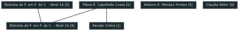 Clique no nome dentro do vértice para visualizar o currículo Lattes. Para cada nó: o valor entre colchetes indica o número de produções feitas em colaboração apenas com os outros membros do próprio grupo.