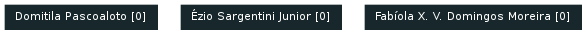 3 curriculos Lattes foram considerados, gerando os seguintes grafos de colaborações encontradas com base nas produções: Artigos completos publicados em periódicos, Livros publicados/organizados ou edições, Capítulos de livros publicados, Textos em jornais de notícias/revistas, Trabalhos completos publicados em anais de congressos, Resumos expandidos publicados em anais de congressos, Resumos publicados em anais de congressos, Artigos aceitos para publicação, Apresentações de trabalho, Demais tipos de produção bibliográfica.