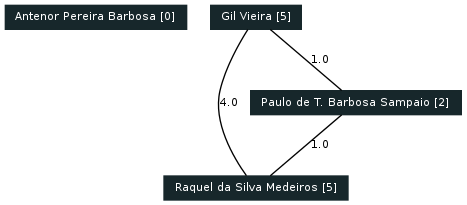 4 curriculos Lattes foram considerados, gerando os seguintes grafos de colaborações encontradas com base nas produções: Artigos completos publicados em periódicos, Livros publicados/organizados ou edições, Capítulos de livros publicados, Textos em jornais de notícias/revistas, Trabalhos completos publicados em anais de congressos, Resumos expandidos publicados em anais de congressos, Resumos publicados em anais de congressos, Artigos aceitos para publicação, Apresentações de trabalho, Demais tipos de produção bibliográfica.
